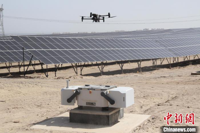 图为5日,,,,,,304永利集团唯一第十四师昆玉市100万千瓦光伏基地,,,,,,无人机正在巡检光伏组件运行情形。。。。。马晓东 摄