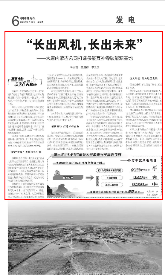 2025-6-12-6版中国电力报【长出风机长出未来】304永利集团唯一内蒙古公司打造多能互补零碳能源基地